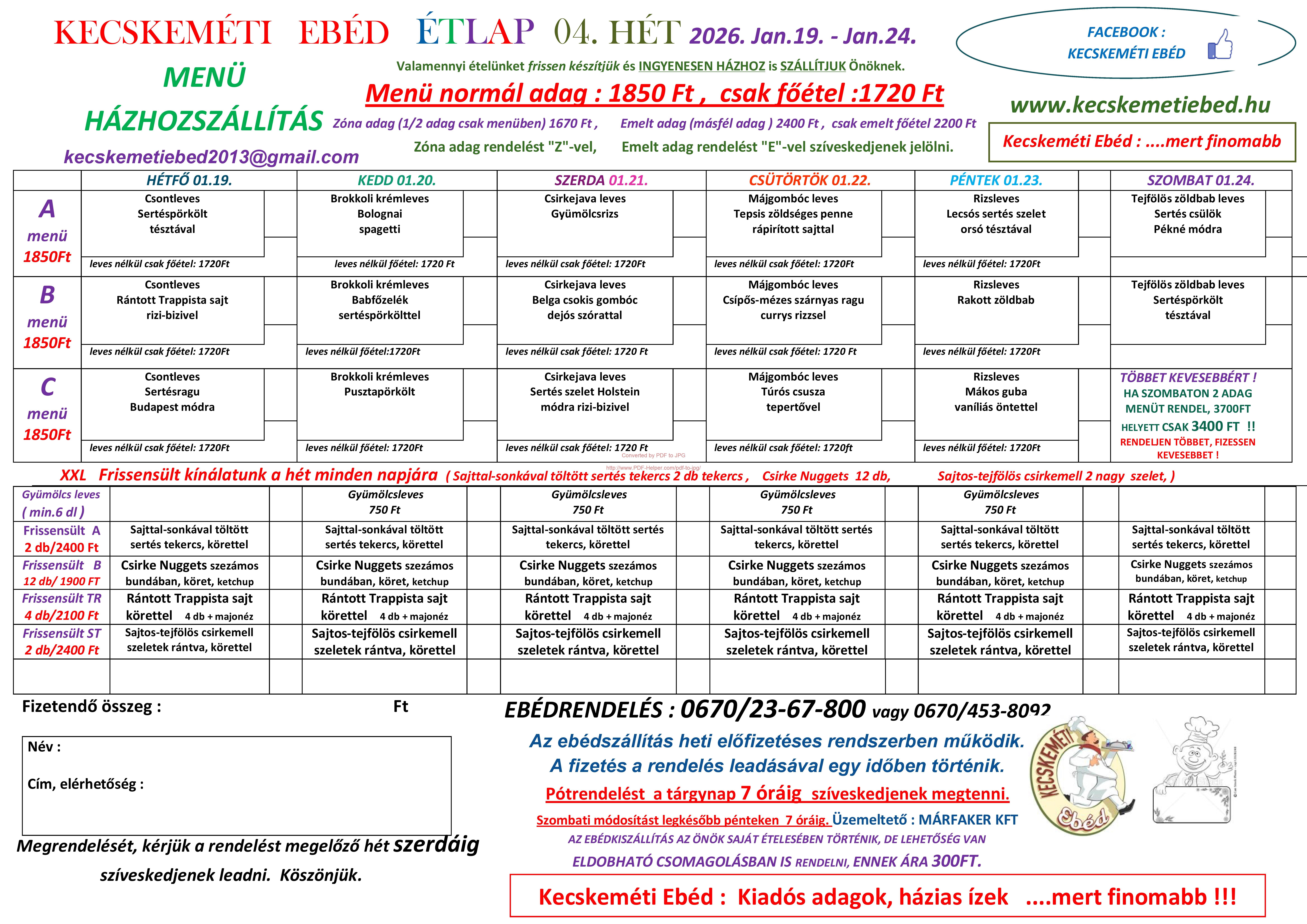 Naponta 3 féle menü és állandó frissensült kínálat házhoz szállítása Kecskeméten