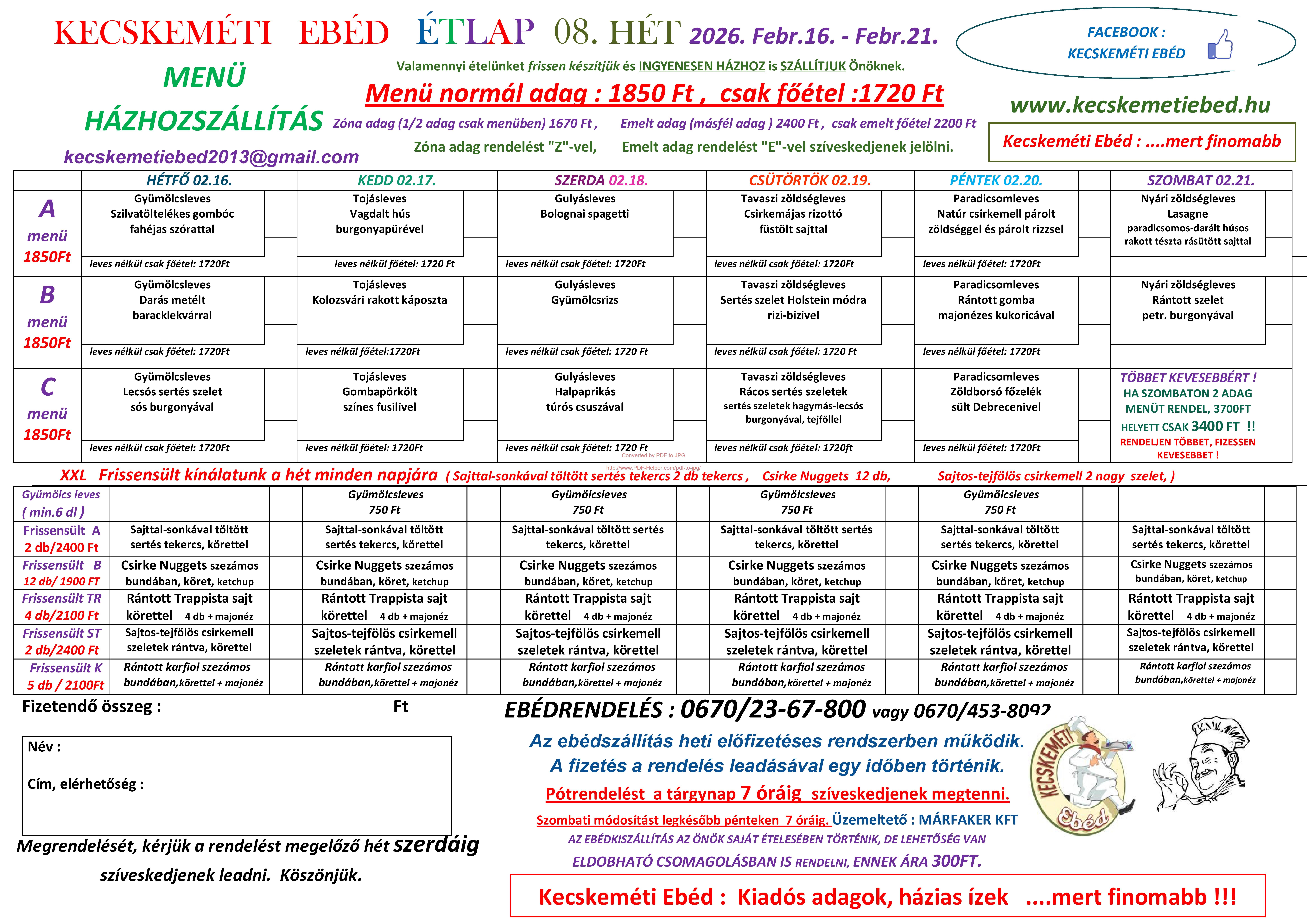 Naponta 3 féle menü és állandó frissensült kínálat házhoz szállítása Kecskeméten
