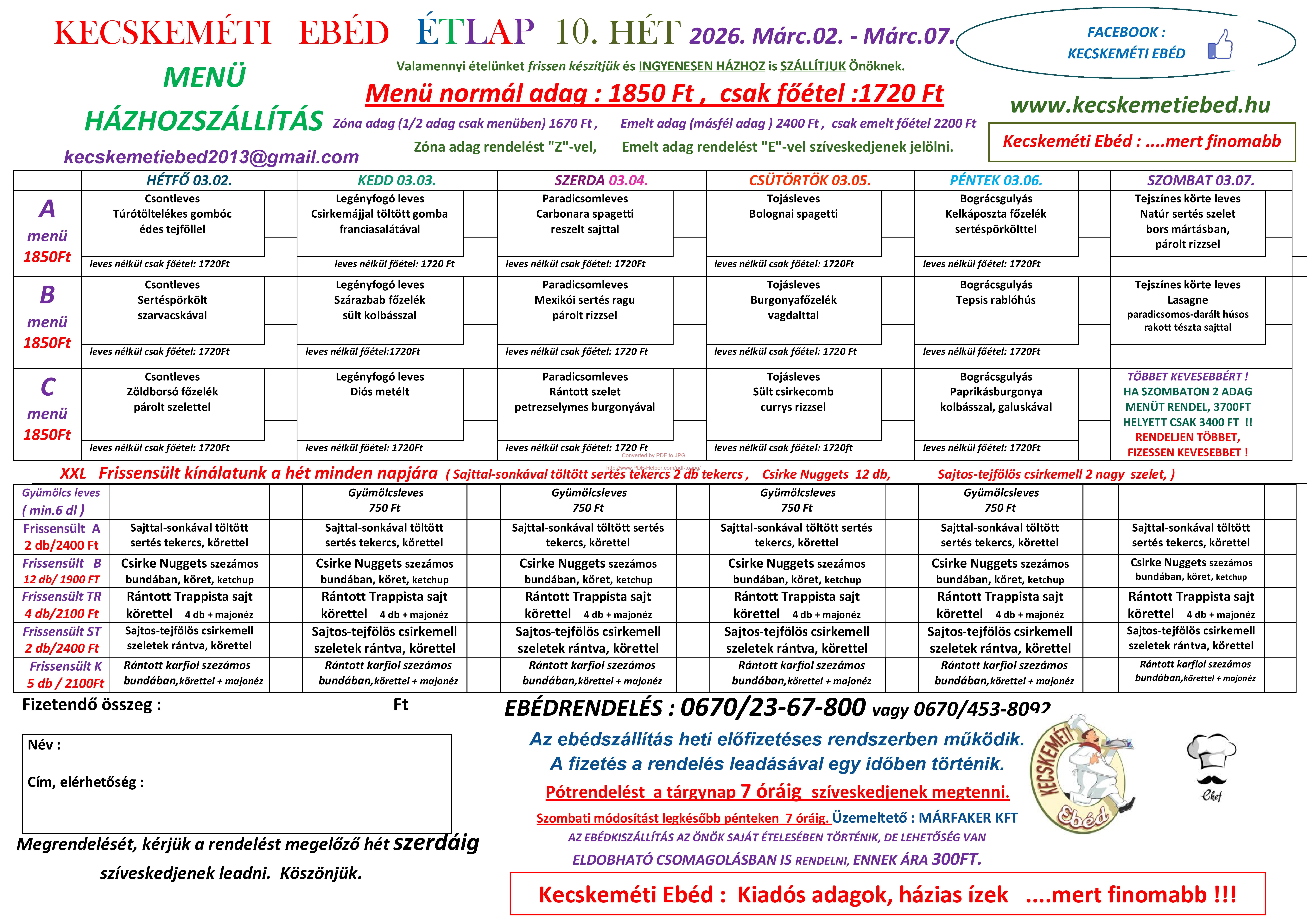 Naponta 3 féle menü és állandó frissensült kínálat házhoz szállítása Kecskeméten