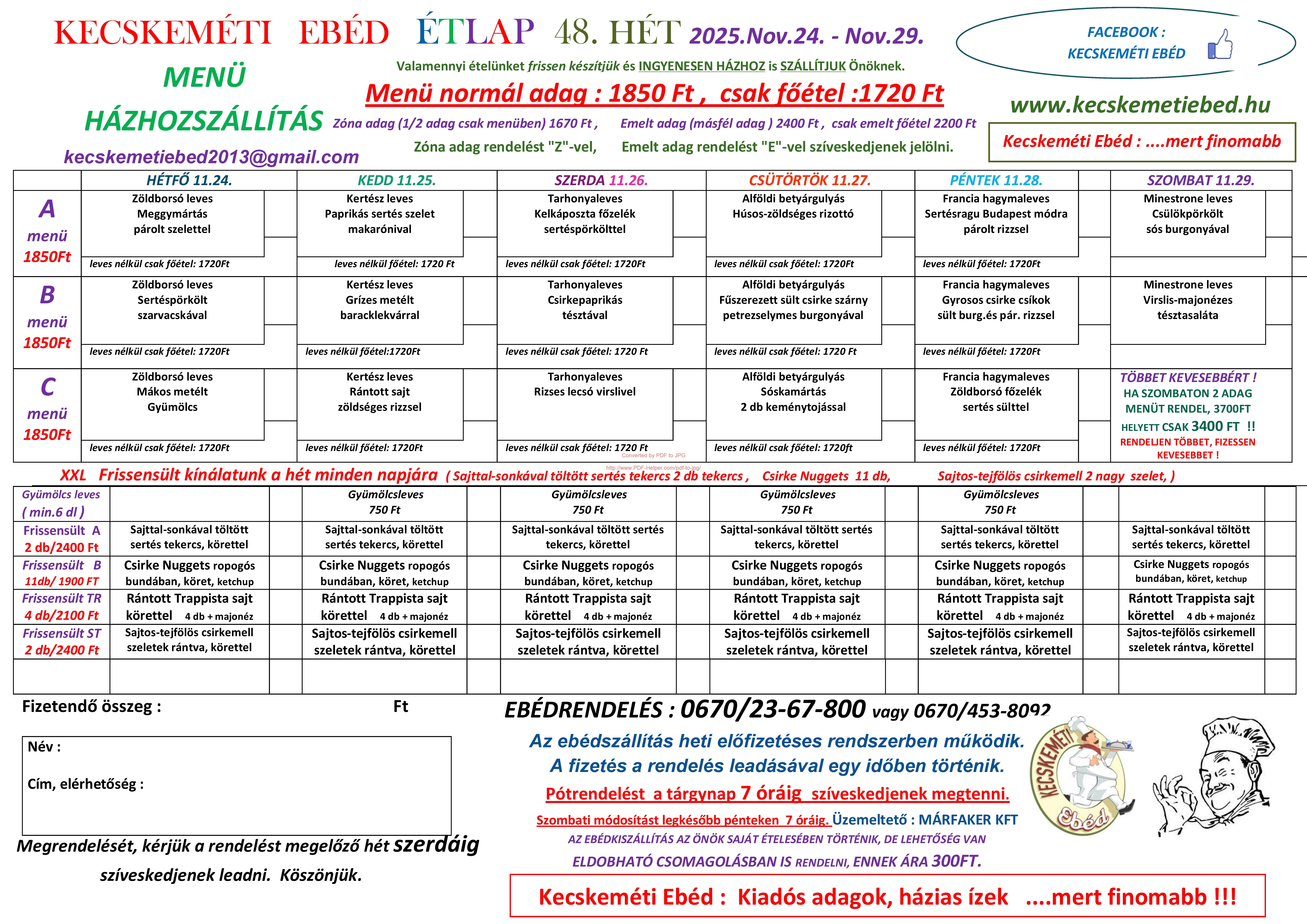 Naponta 3 féle menü és állandó frissensült kínálat házhoz szállítása Kecskeméten