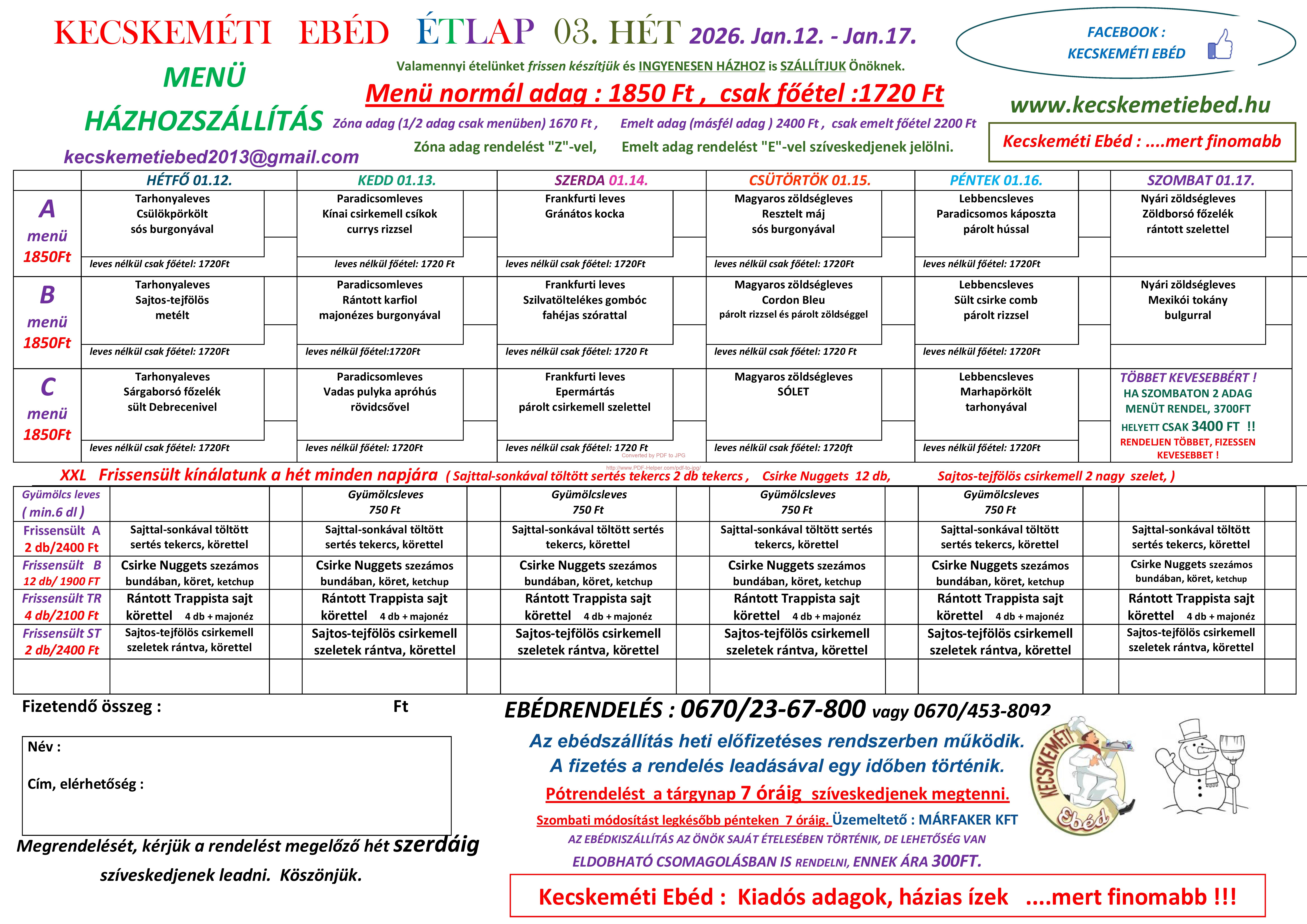 Naponta 3 féle menü és állandó frissensült kínálat házhoz szállítása Kecskeméten