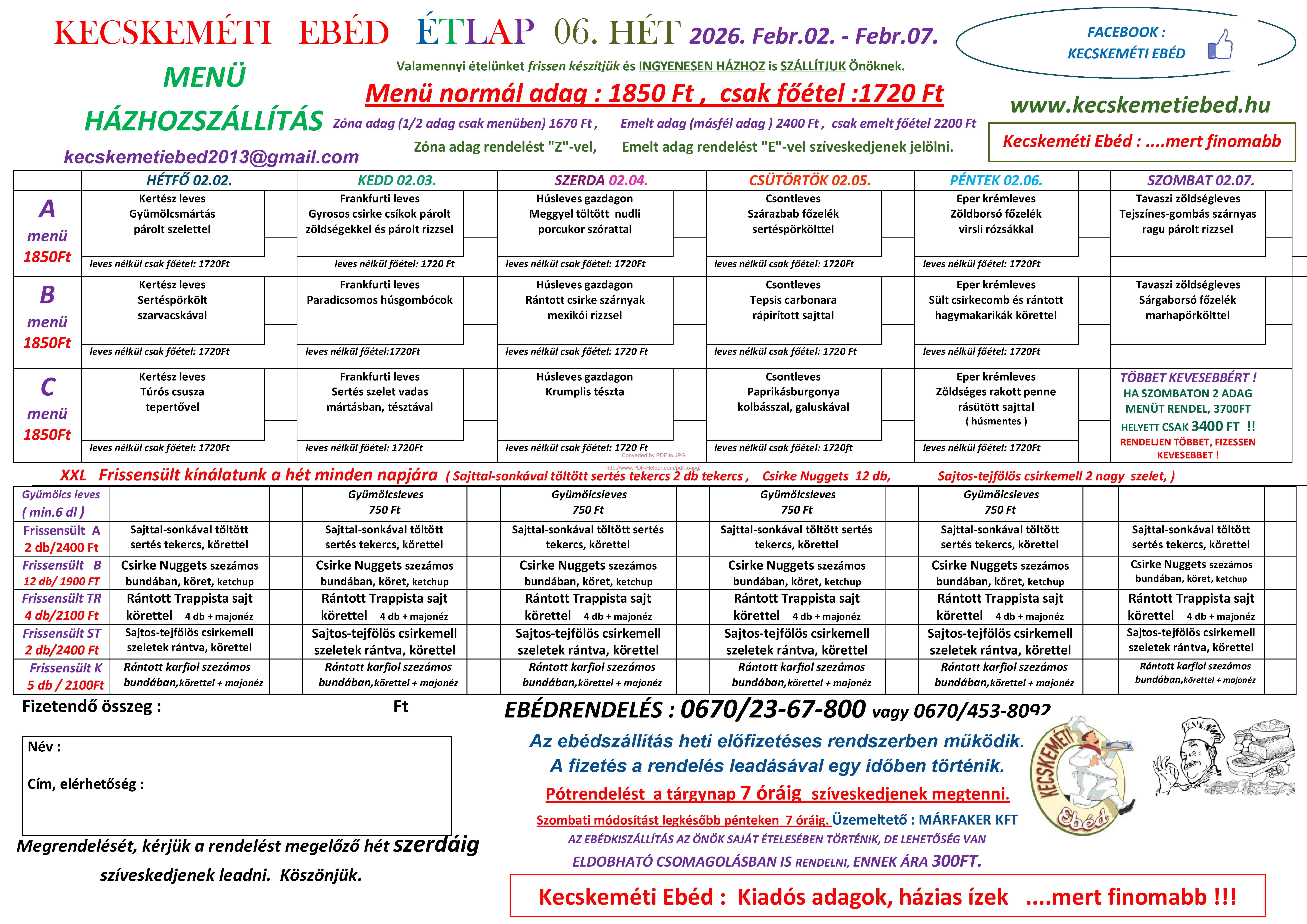 Naponta 3 féle menü és állandó frissensült kínálat házhoz szállítása Kecskeméten