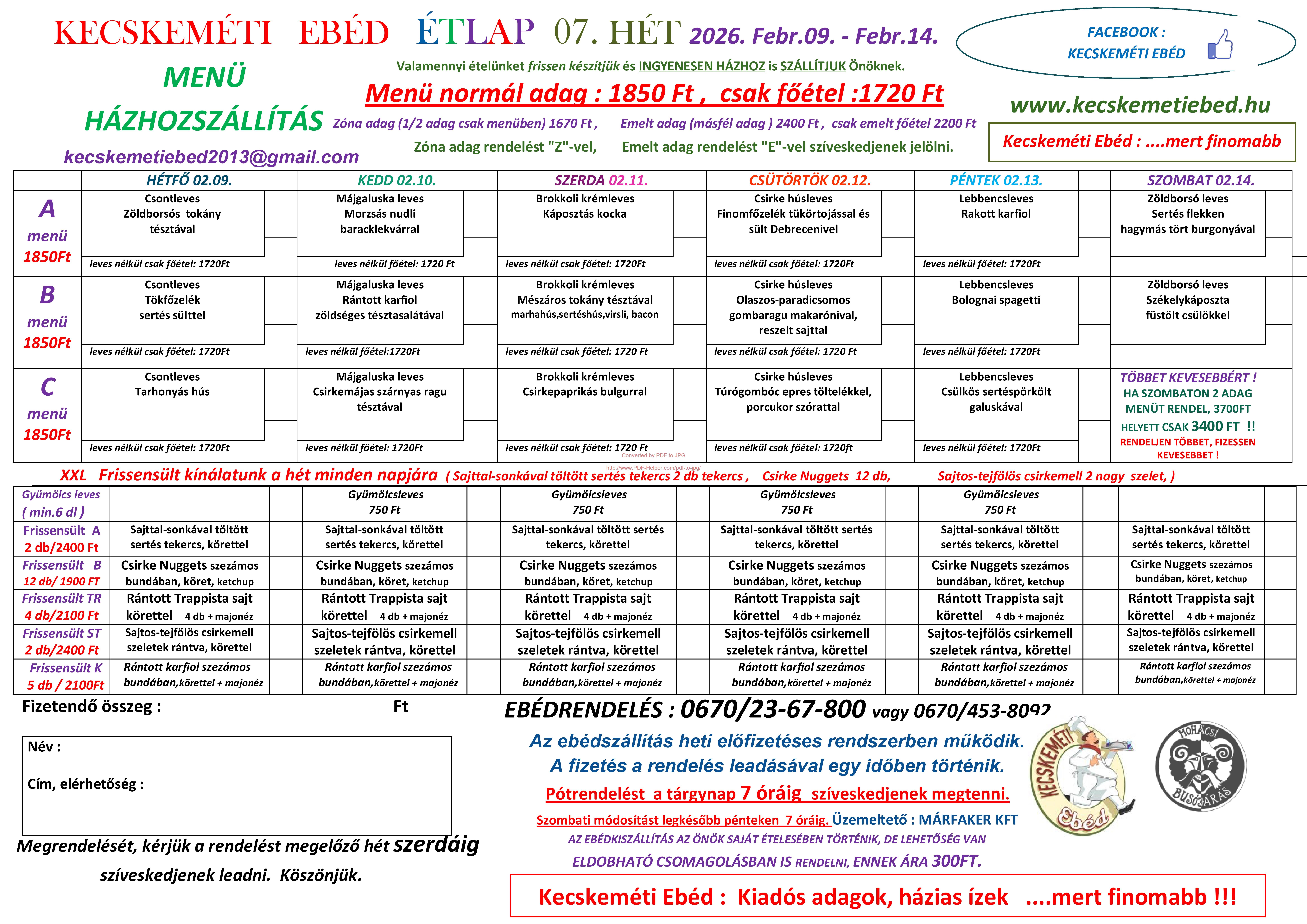Naponta 3 féle menü és állandó frissensült kínálat házhoz szállítása Kecskeméten