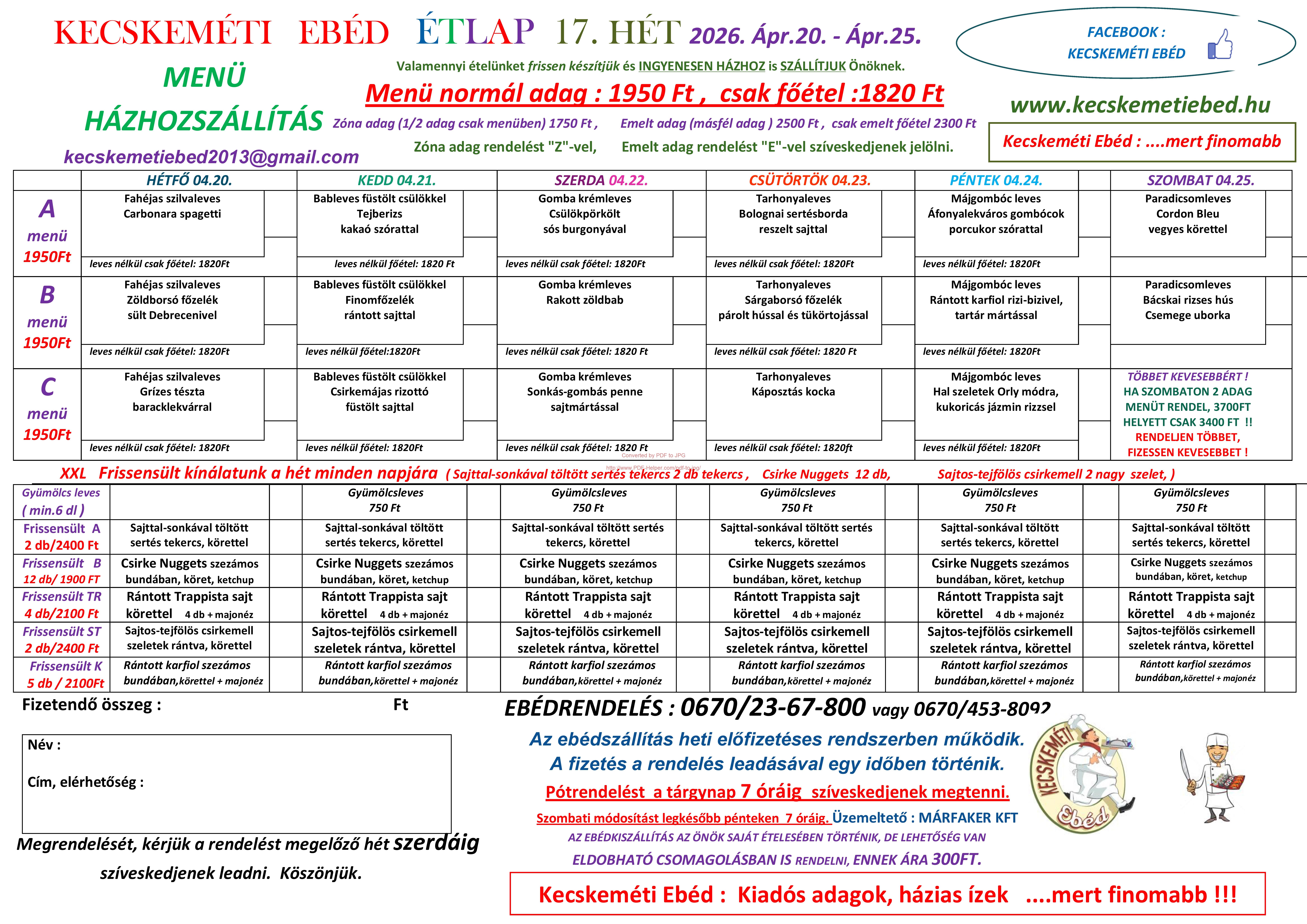 Naponta 3 féle menü és állandó frissensült kínálat házhoz szállítása Kecskeméten
