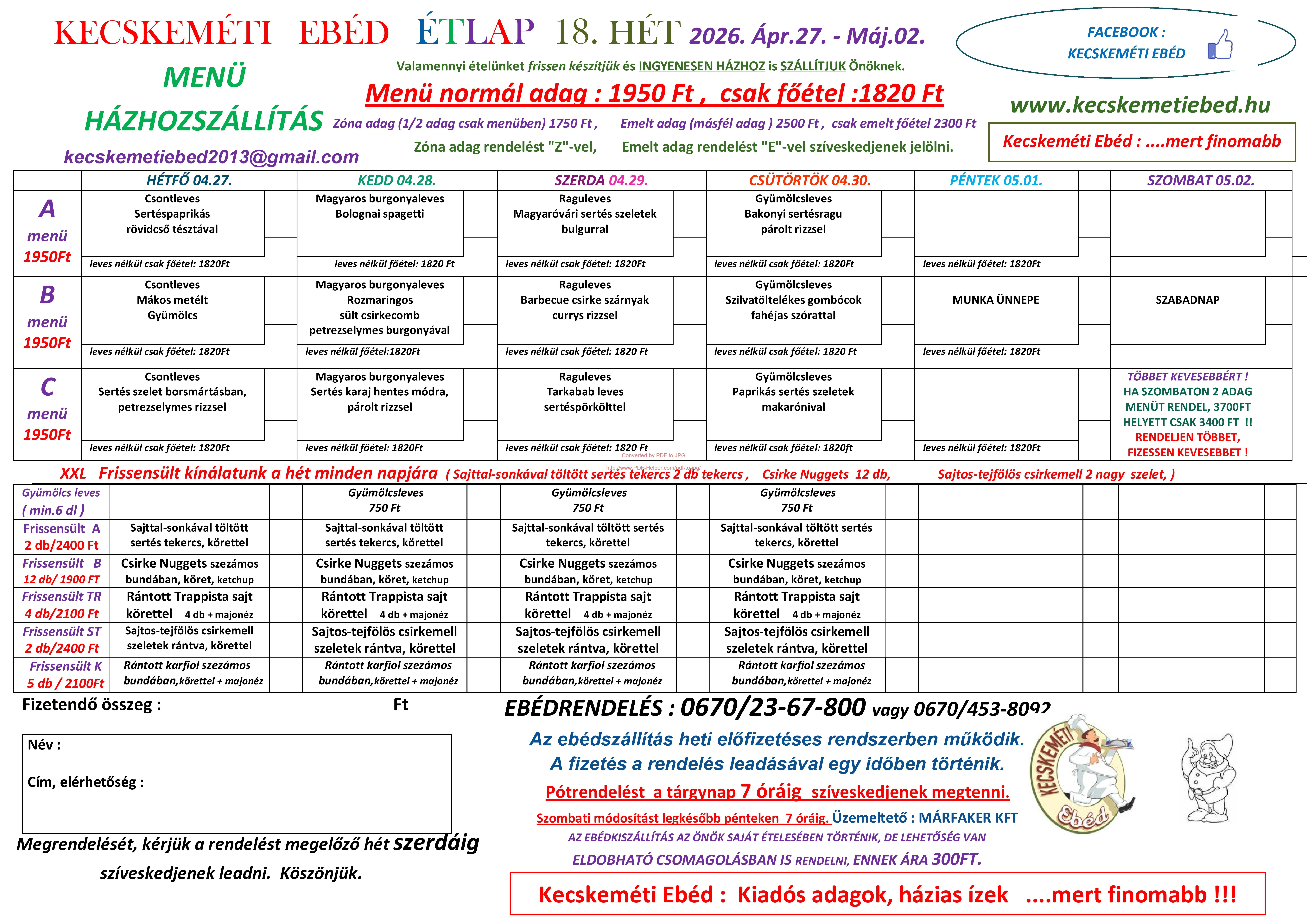 Naponta 3 féle menü és állandó frissensült kínálat házhoz szállítása Kecskeméten