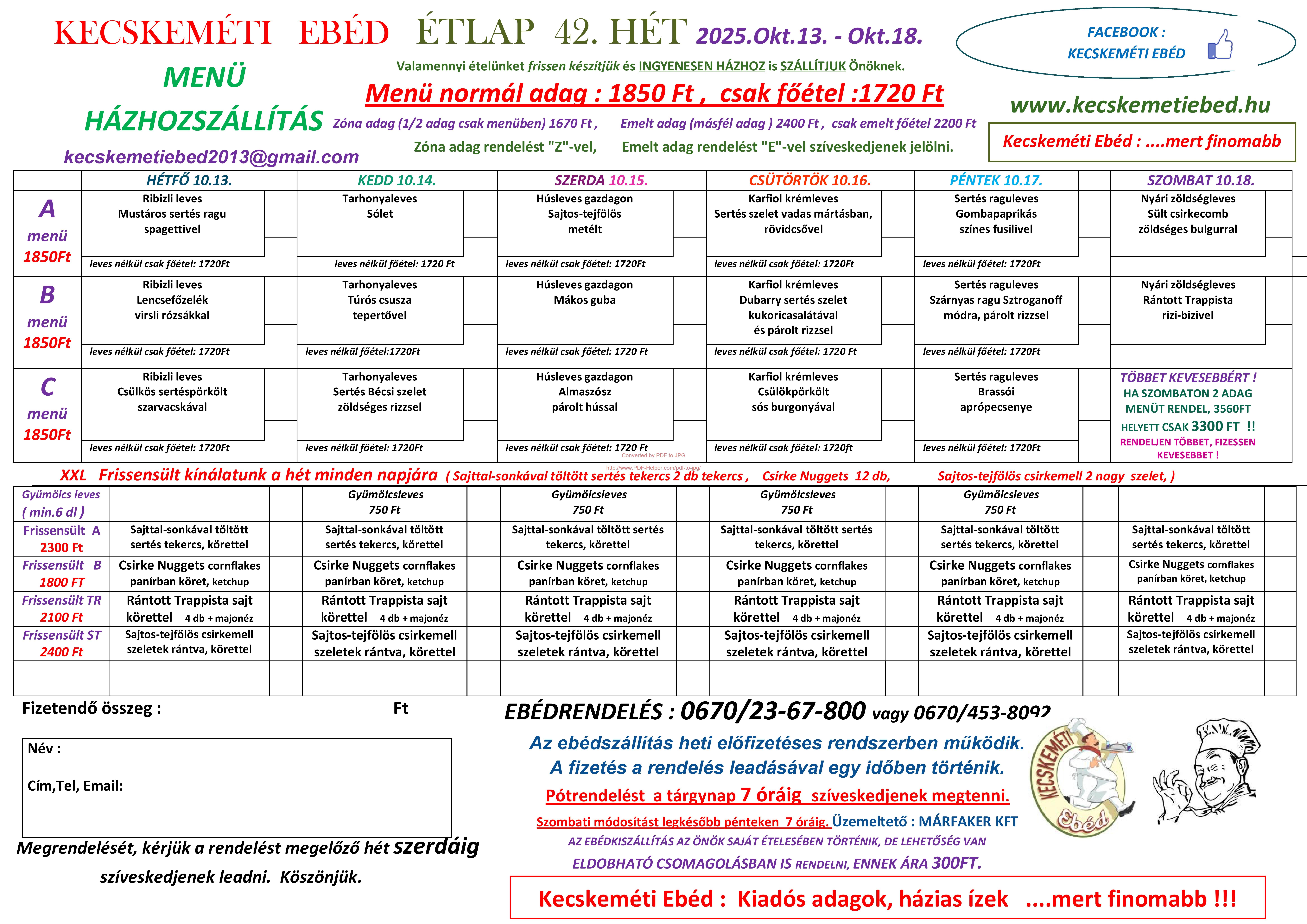 Naponta 3 féle menü és állandó frissensült kínálat házhoz szállítása Kecskeméten